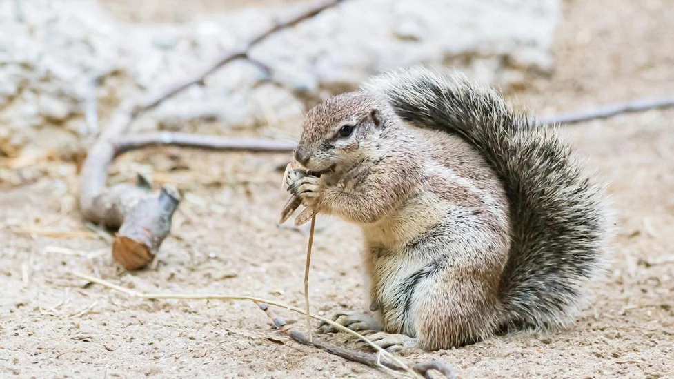 Der buschige Schwanz von den Borstenhörnchen hat die Funktion als Sonnenschirm. Wird es sehr warm stellen sie ihn auf und geben sich damit selber Schatten.