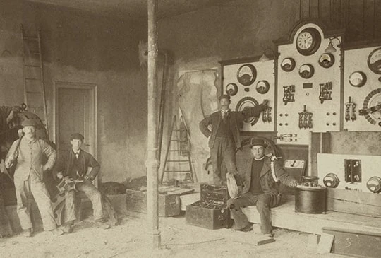 Fotografie aus dem Jahr 1900: Die Gleichstromschalttafel und Umformergruppen werden in Liestal montiert.
