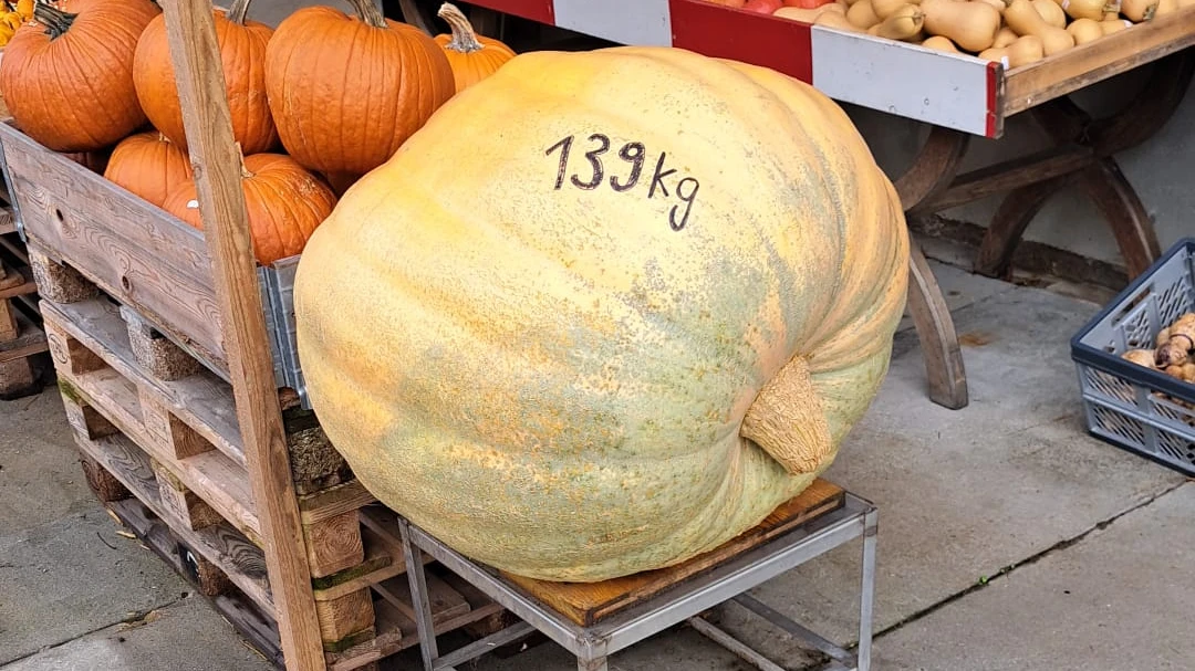 Dieses schöne Foto hat uns Basilisk-Hörer Dominik aus Nenzlingen in Baselland geschickt. Das Bild zeigt den vermutlich grössten Kürbis der Region. Er bringt stolze 139 Kilogramm auf die Waage. Die grossen Landwirtschaftsbetriebe in der Region züchten lieber kleinere Kürbisse.