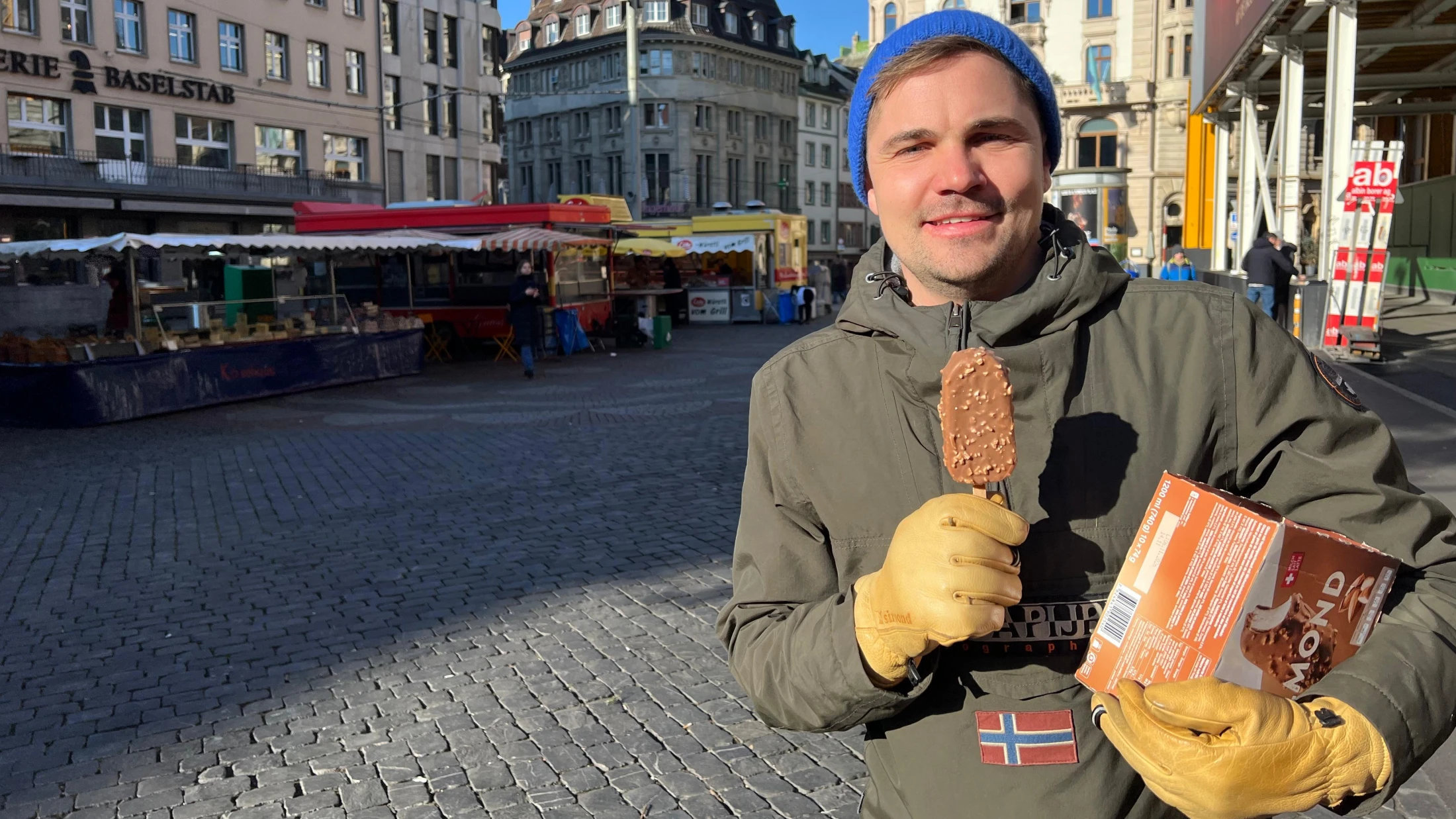 Die Antwort auf diese Frage hat Basilisk-Moderator Mirco Rust in seiner Sendung geklärt. Bewaffnet mit eine Kiste Glacé ist er losgezogen und hat versucht, trotz frostigen und eisigen Bedingungen, seine Ladung an Frau und Mann zu bringen.