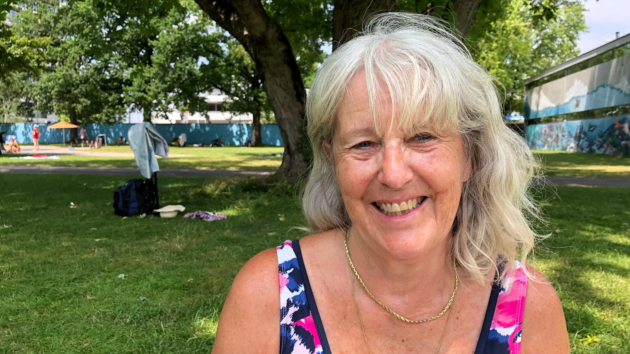 Conny ist im Bündnerland aufgewachsen, lebt aber schon lange im Baselbiet. Muscle-Shirts findet Conny blöd. Wer viele Muskeln hat, müsse auch bei 30 Grad nicht mit Shirt in der Badi herumlaufen, findet sie. Conny ist bei der Badi-Gruppe «Rimini Süd» dabei. Die Badifreunde treffen sich täglich unter dem grossen Baum im Bachgraben.